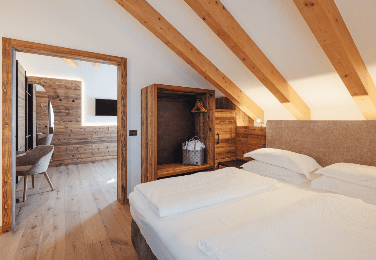 The new 39-square-metre Junior Suite Prà Fiorì was created for summer 2025 and welcomes you in a spacious and comfortable space with all the charm of an attic room. The room is made more charming by our aged fir wood furniture and oak floors. It has two rooms that can be separated by a sliding door, a king-size bed area and a living area with a pull-out sofa. Comfort is also ensured by the presence of the two bathrooms (one with a window) and both with showers . The south-facing balcony offers a view of the Lagorai chain, in particular of the Alpe Cermis from whose famous slope Prà Fiorì takes its name.