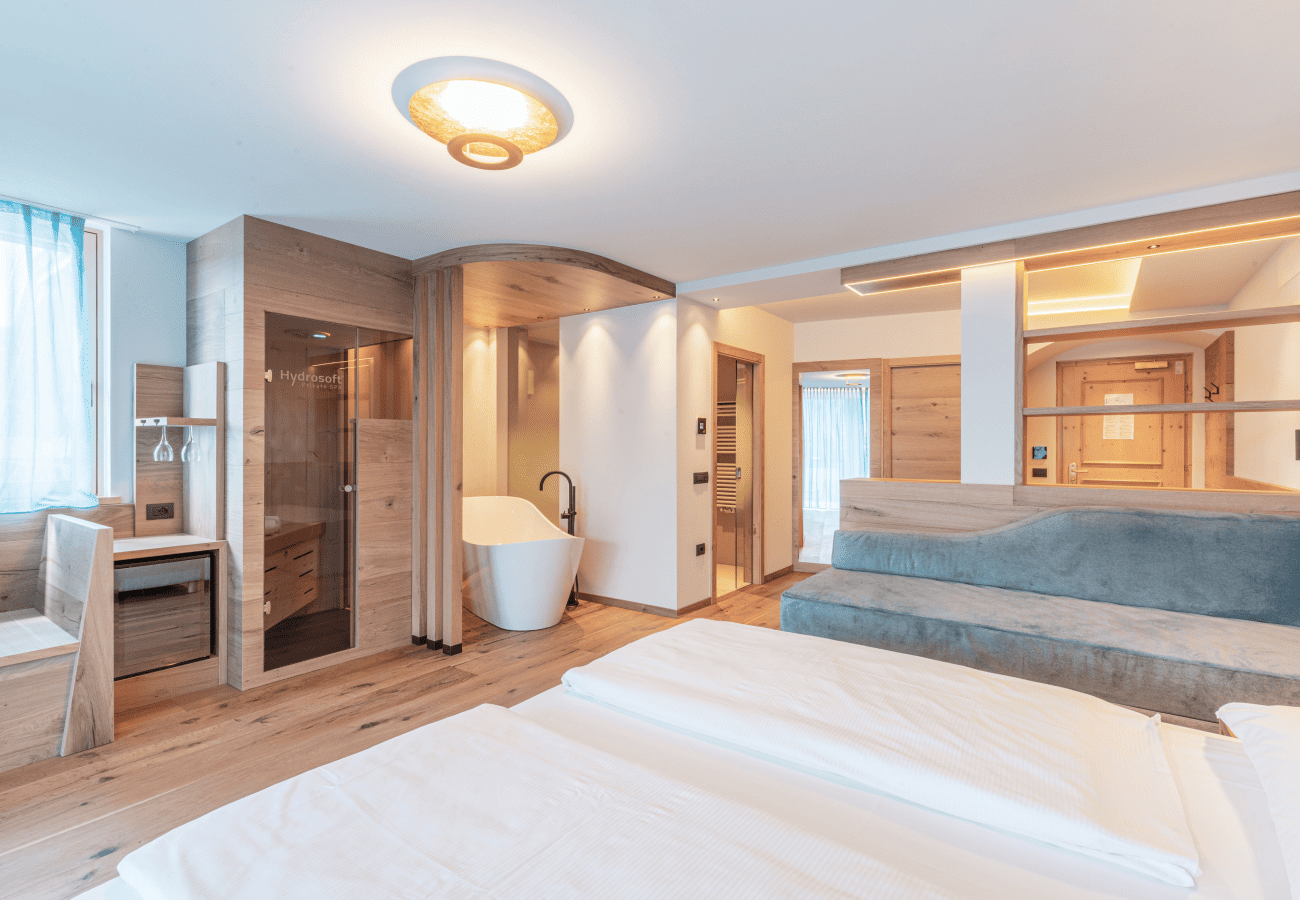 The romantic couple, as well as the active family, deserve unforgettable moments of total relax, in our Suites with Private Bio-Sauna (deep heat) and a large south-facing balcony from which to admire the colours of the forests and peaks of the Lagorai Chain.